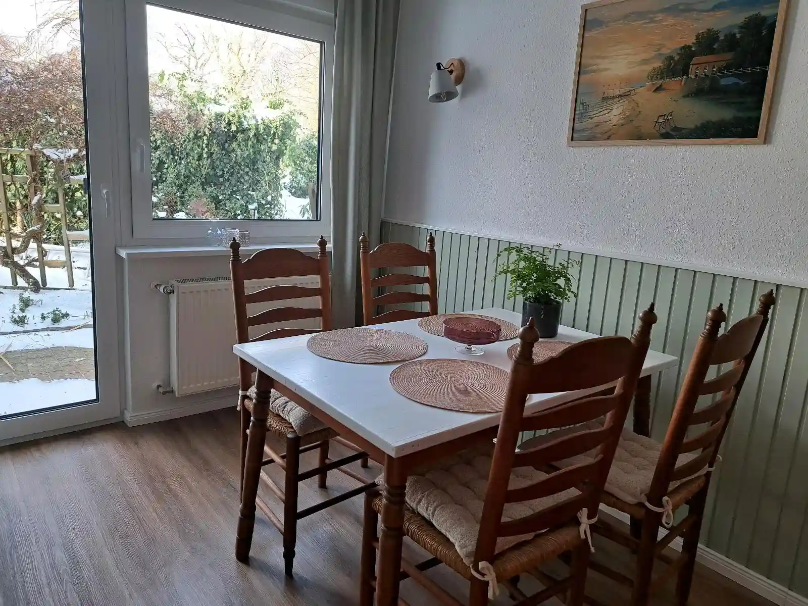 Ferienwohnung nahe Zwischenahner Meer: Moderner Essbereich und Küche mit Design-Tapete für Ihren Urlaub.