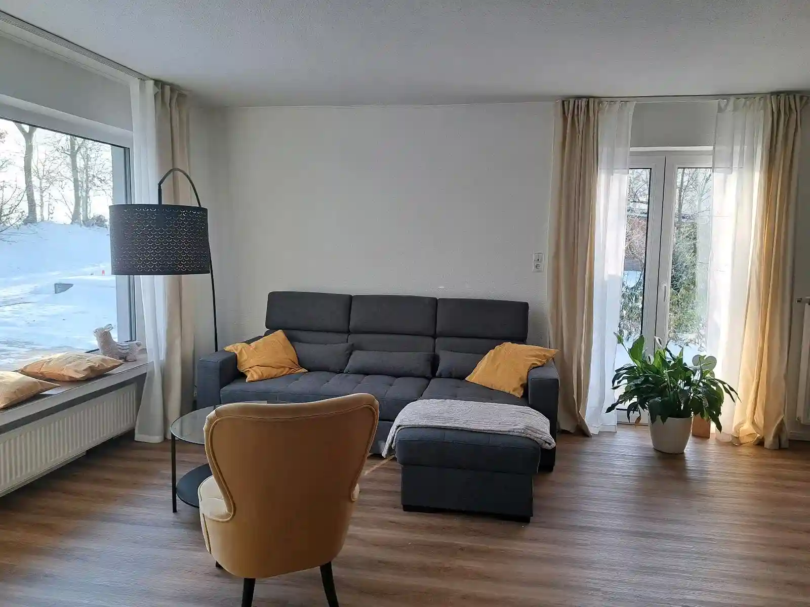 Ferienhaus Niedersachsen: Modernes Wohnzimmer mit Sofa und gelbem Sessel für Urlaub nahe der Nordsee.